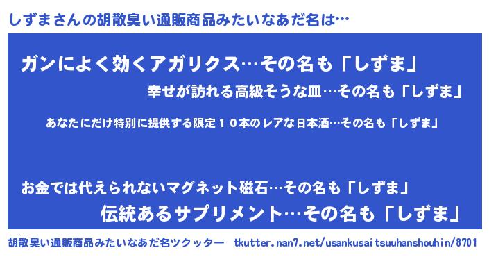 | 意味不明あだ名 | 『住所不定無職しずま(68歳)』『自称しずま』 |