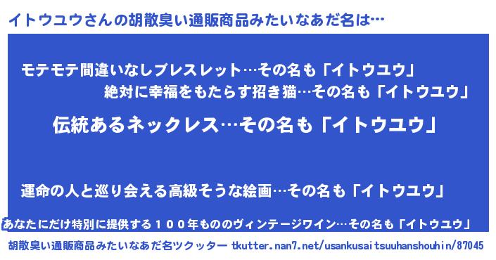 | 男性向けラノベタイトル風あだ名 | 『イトウユウの嫁は女の子じゃないと思った?』 |