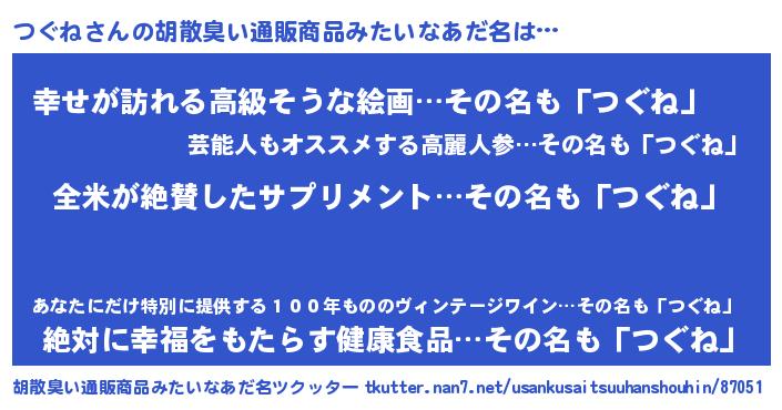 | 意味不明あだ名 | 『とにかく怪しいつぐね』『自称つぐね』 |