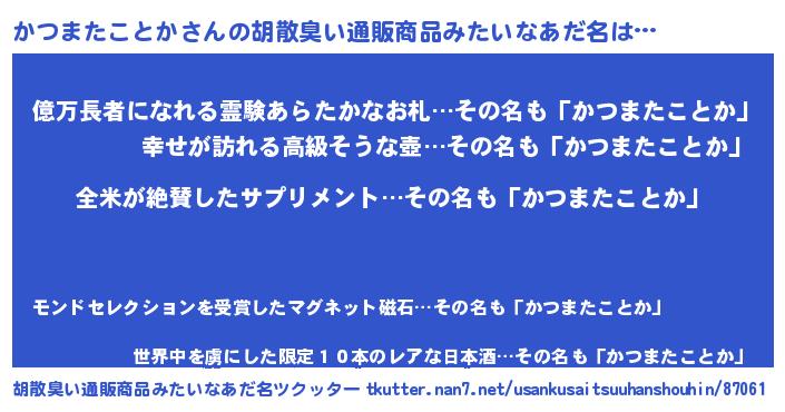| 欧米人風あだ名 | 『ウサインかつまたことか』 |