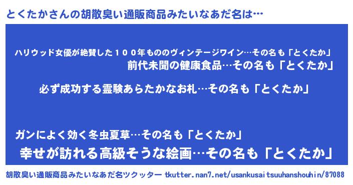 | 男性向けラノベタイトル風あだ名 | 『とくたかの憂鬱』『魔弾の王ととくたか』 |