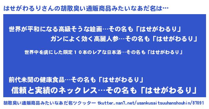 | 意味不明あだ名 | 『住所不定無職はせがわるり(68歳)』 |