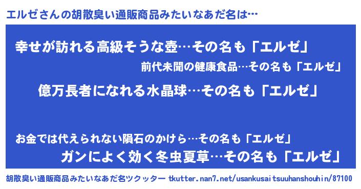 | 男性向けラノベタイトル風あだ名 | 『エルゼに滅ぼされるだけの簡単なお仕事です』 |