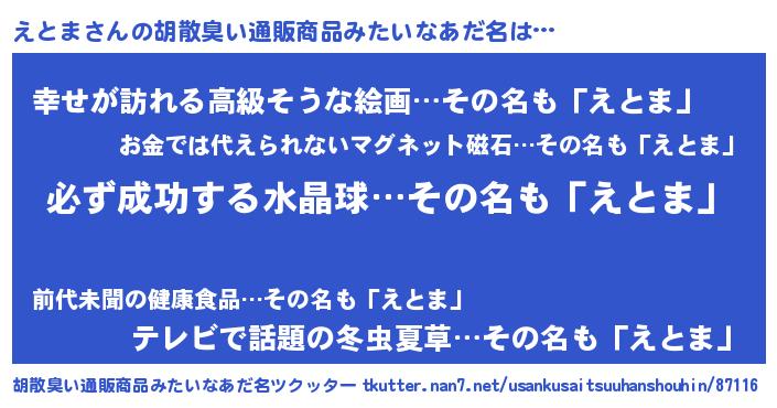 | 男性向けラノベタイトル風あだ名 | 『えとまの憂鬱』『はたらくえとまさま!』 |