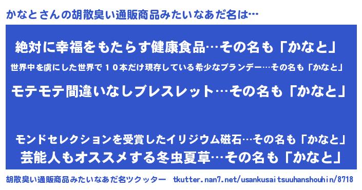 | 男性向けラノベタイトル風あだ名 | 『かなとの憂鬱』『魔弾の王とかなと』 |