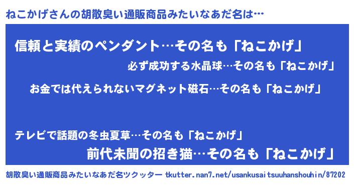 | 欧米人風あだ名 | 『ダニエルねこかげ』『ウサインねこかげ』 |