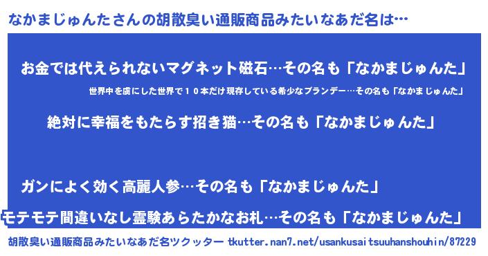 | 男性向けラノベタイトル風あだ名 | 『なかまじゅんたという概念が存在しない退屈な世界 』 |