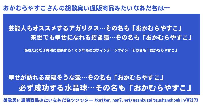 | ヘコむあだ名 | 『おかふぇ~』『おかむらやすこ(苦笑)』 |
