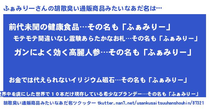 | ヘコむあだ名 | 『ふぁみりー(笑)』『ふぁにゅー』 |