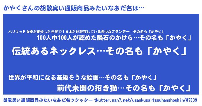 | 男性向けラノベタイトル風あだ名 | 『かやくの嫁は女の子じゃないと思った?』 |