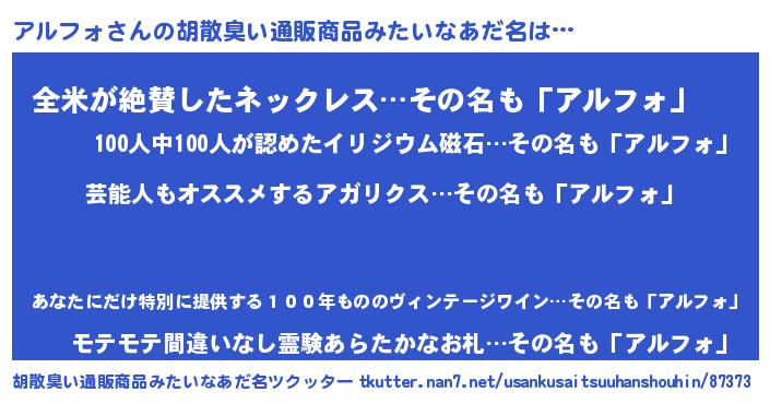 | 男性向けラノベタイトル風あだ名 | 『アルフォに滅ぼされるだけの簡単なお仕事です』 |
