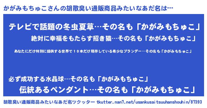 | 意味不明あだ名 | 『住所不定無職かがみもちゅこ(91歳)』 |