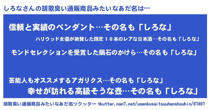 | 女子向けラノベタイトル風あだ名 | 『死神しろなの再婚』『しろな様がみてる』 |