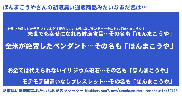 | 男性向けラノベタイトル風あだ名 | 『ほんまこうやの嫁は女の子じゃないと思った?』 |