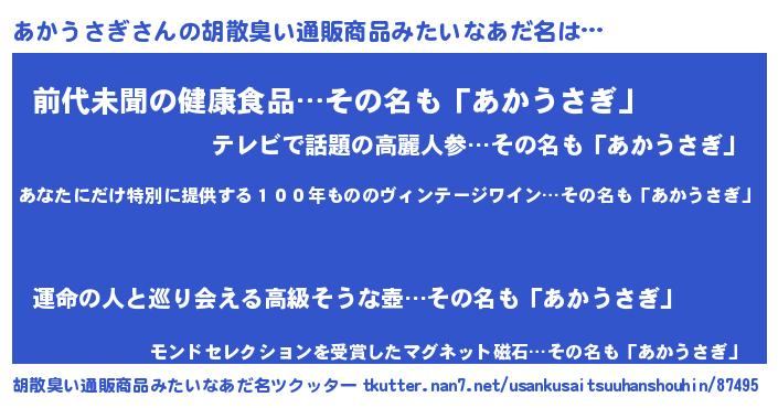| 意味不明あだ名 | 『住所不定無職あかうさぎ(2歳)』 |