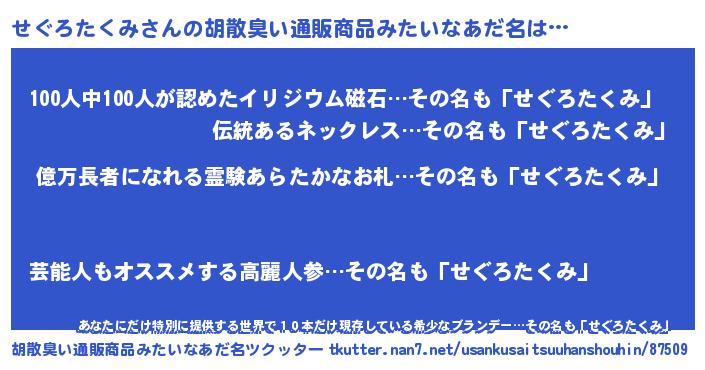 | 男性向けラノベタイトル風あだ名 | 『うちのせぐろたくみが世界を掌握している!』 |