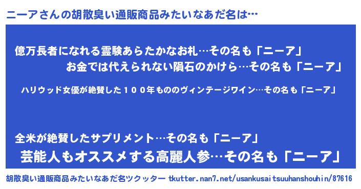 | 意味不明あだ名 | 『住所不定無職ニーア(1歳)』『自称ニーア』 |