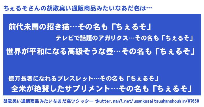 | ヘコむあだ名 | 『豆乳』『ちぇるそ(爆)』『ちぇを』 |