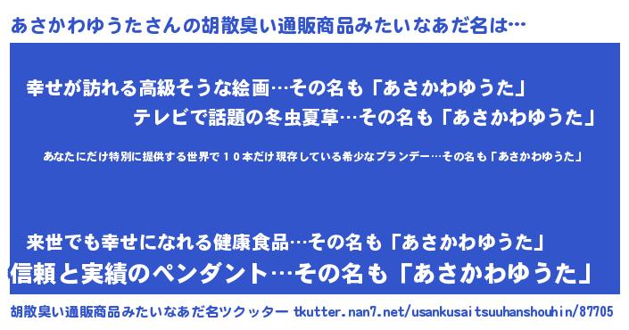 | 意味不明あだ名 | 『住所不定無職あさかわゆうた(81歳)』 |