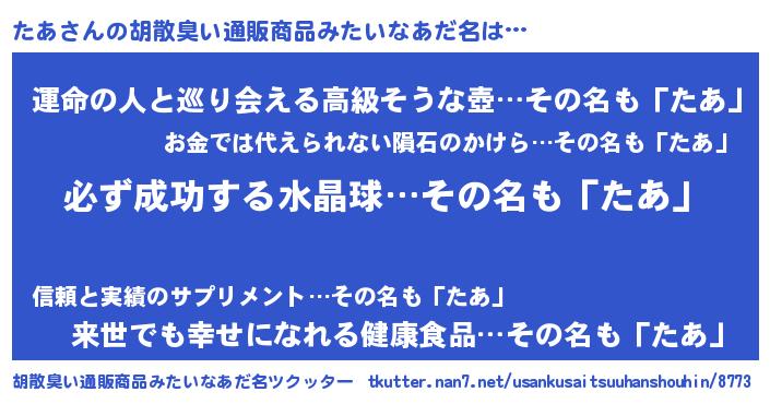 | 男性向けラノベタイトル風あだ名 | 『たあの憂鬱』『転生したらたあだった件』 |