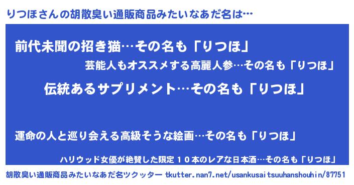 | 意味不明あだ名 | 『とにかく怪しいりつほ』『自称りつほ』 |