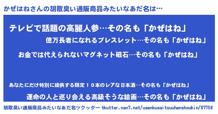 | 男性向けラノベタイトル風あだ名 | 『ノーゲーム・ノーカゼハネ』 |
