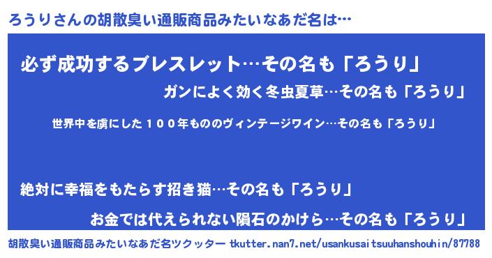 | 意味不明あだ名 | 『住所不定無職ろうり(3歳)』『自称ろうり』 |