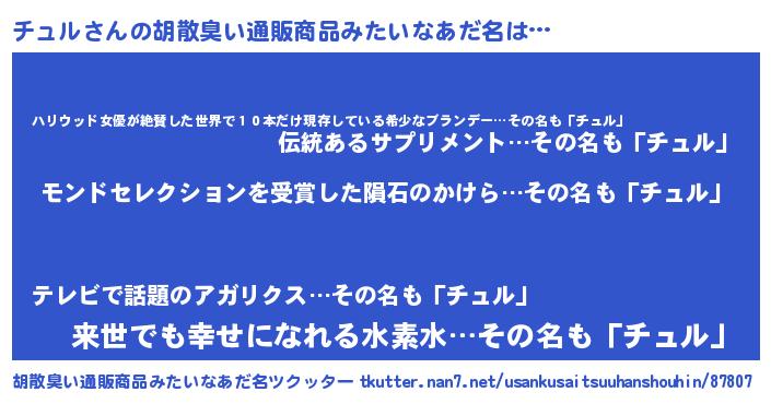 | 伝説のあだ名 | 『救世主となる錬金術士チュル』 |