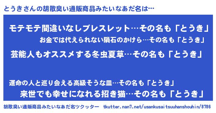 | 恥ずかしいあだ名 | 『トウキデラックス』『プリティーとうき』 |