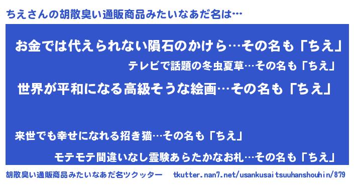 | 女子向けラノベタイトル風あだ名 | 『ちえ伯爵の花嫁』『ちえ夫妻のなれそめ』 |