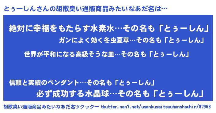 | ヘコむあだ名 | 『豆乳』『とぅーしん(小並感)』 |