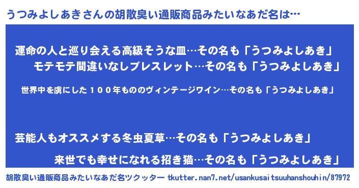 | ヒーロー風カッコイイあだ名 | 『仮面ウツダー』『ネオウツミヨシアキ』 |