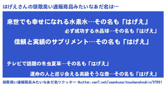 | 意味不明あだ名 | 『とにかく怪しいはげえ』『自称はげえ』 |