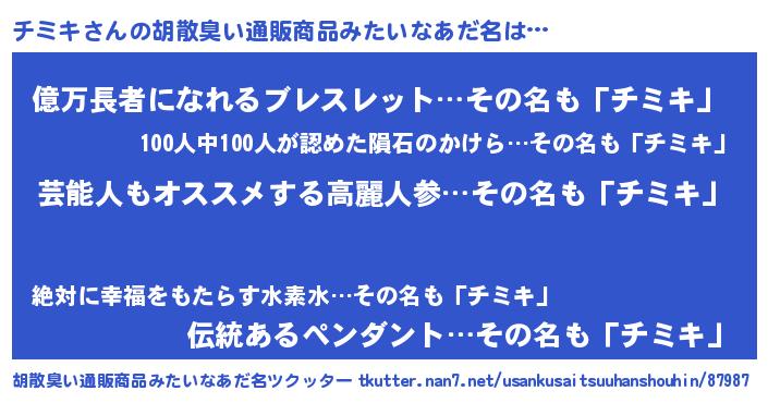 | 男性向けラノベタイトル風あだ名 | 『Re:チミキから始める異世界生活』 |