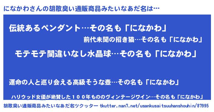 | 男性向けラノベタイトル風あだ名 | 『ニナカワアートオンライン』 |