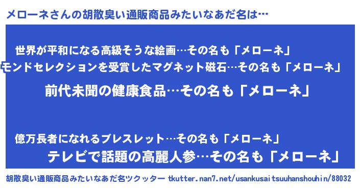 | ヘコむあだ名 | 『メローネ(笑)』『豆乳』『メロお』 |