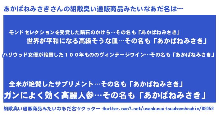 | 意味不明あだ名 | 『住所不定無職あかばねみさき(4歳)』 |
