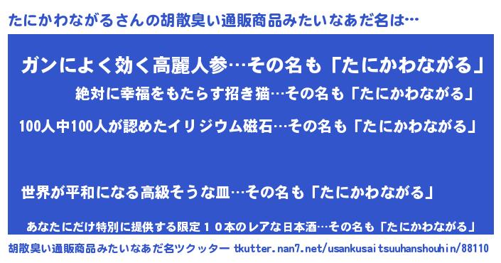 | 男性向けラノベタイトル風あだ名 | 『緋弾のタニカワナガル』 |