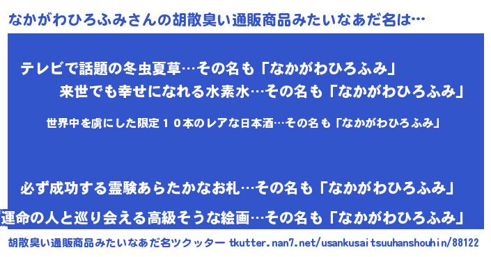 | 意味不明あだ名 | 『住所不定無職なかがわひろふみ(53歳)』 |