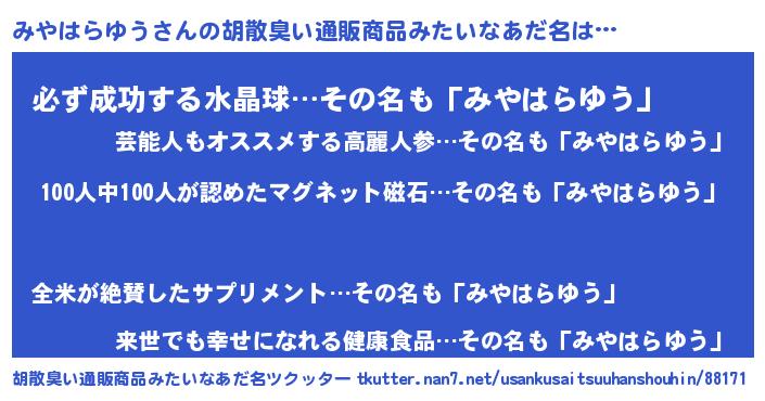 | 男性向けラノベタイトル風あだ名 | 『おまえをオタクにしてやるから、俺をみやはらゆうにしてくれ! 』 |