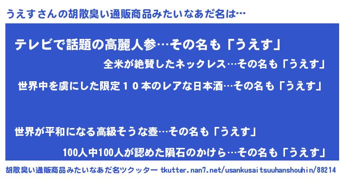 | 男性向けラノベタイトル風あだ名 | 『この素晴らしい世界にうえすを!』 |