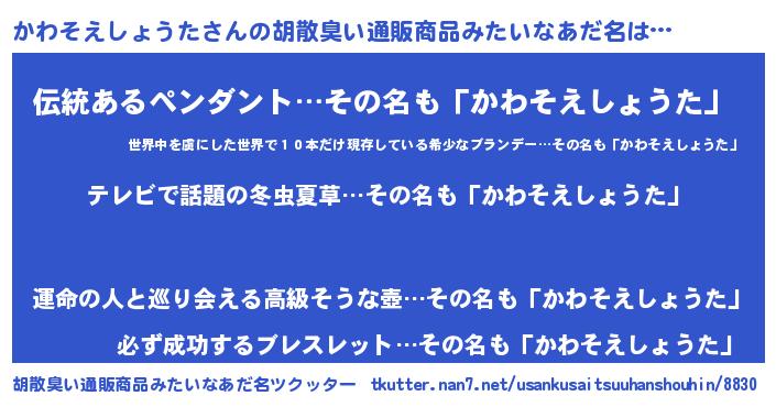 | 意味不明あだ名 | 『自称かわそえしょうた』 |