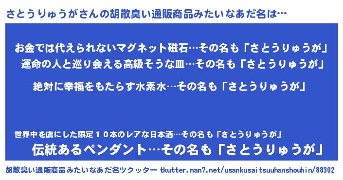 | ヘコむあだ名 | 『さとうりゅうが(遠い目)』『さとっちょ』 |