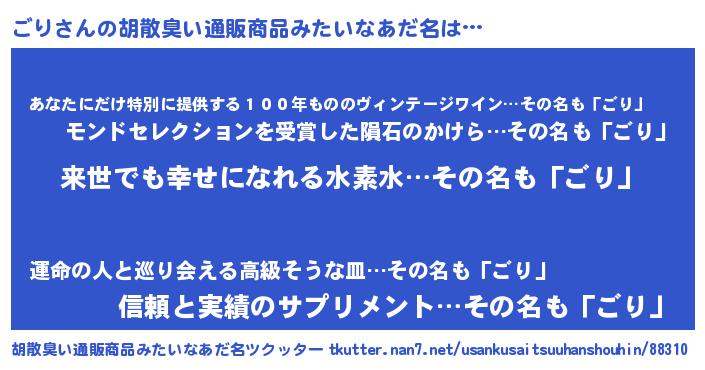 | 男性向けラノベタイトル風あだ名 | 『はたらくごりさま!』『魔弾の王とごり』 |