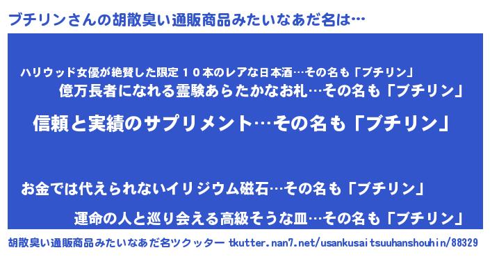 | 男性向けラノベタイトル風あだ名 | 『ダンジョンにブチリンを求めるのは間違っているだろうか』 |