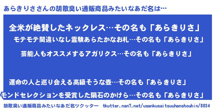 | 男性向けラノベタイトル風あだ名 | 『あらきりさ~年齢イコール彼女いない歴の魔法使い~』 |