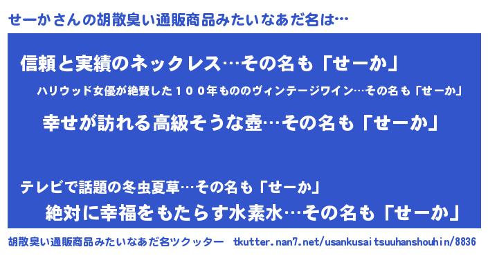 | 意味不明あだ名 | 『せーかフォーエバー』『永久保存せーか』 |