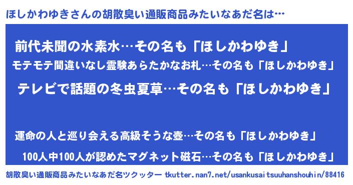 | ヘコむあだ名 | 『ほしかわゆき(遠い目)』『ほしっふぃ~』 |