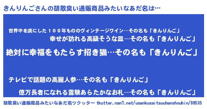 | 男性向けラノベタイトル風あだ名 | 『きんりんごという概念が存在しない退屈な世界 』 |