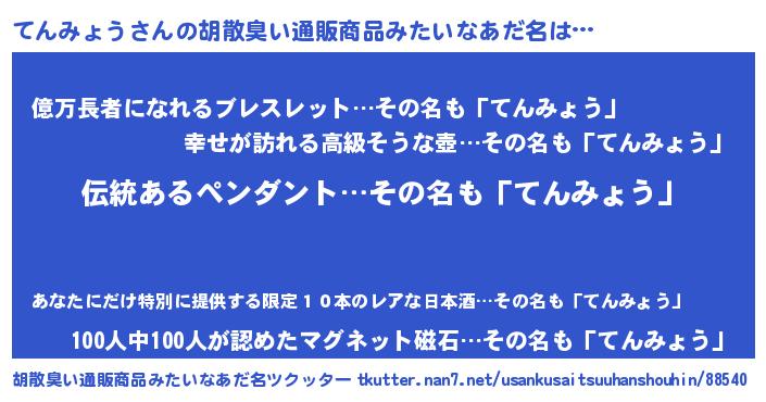 | 男性向けラノベタイトル風あだ名 | 『ダンジョンにてんみょうを求めるのは間違っているだろうか』 |
